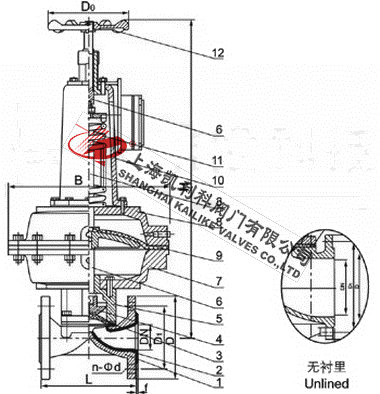 6、閥體與蓋被中間隔膜隔開,使得隔膜上方的閥蓋,閥桿等零件不受介質侵蝕。
