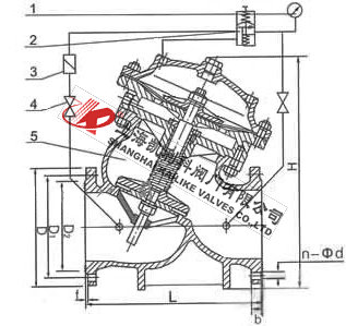 當管道從進水端給水時,水流過針閥進入主閥控制室,出口壓力通過導管作用到導閥上,當出口壓力高于導閥設定值時,導閥關閉,控制室停止排水,此時主閥控制室內壓力升高并關閉主閥,出口壓力不再升高。當出口壓力降到導閥設定壓力時導閥開啟,控制室向下游排水。由于導閥的排水量大于針閥的進水量,主閥控制室壓力下降,進口壓力使主閥開啟。穩定狀態下,控制室進水、排水相同,開度不變,出口壓力不變。調節導閥彈簧即可設定出口壓力。